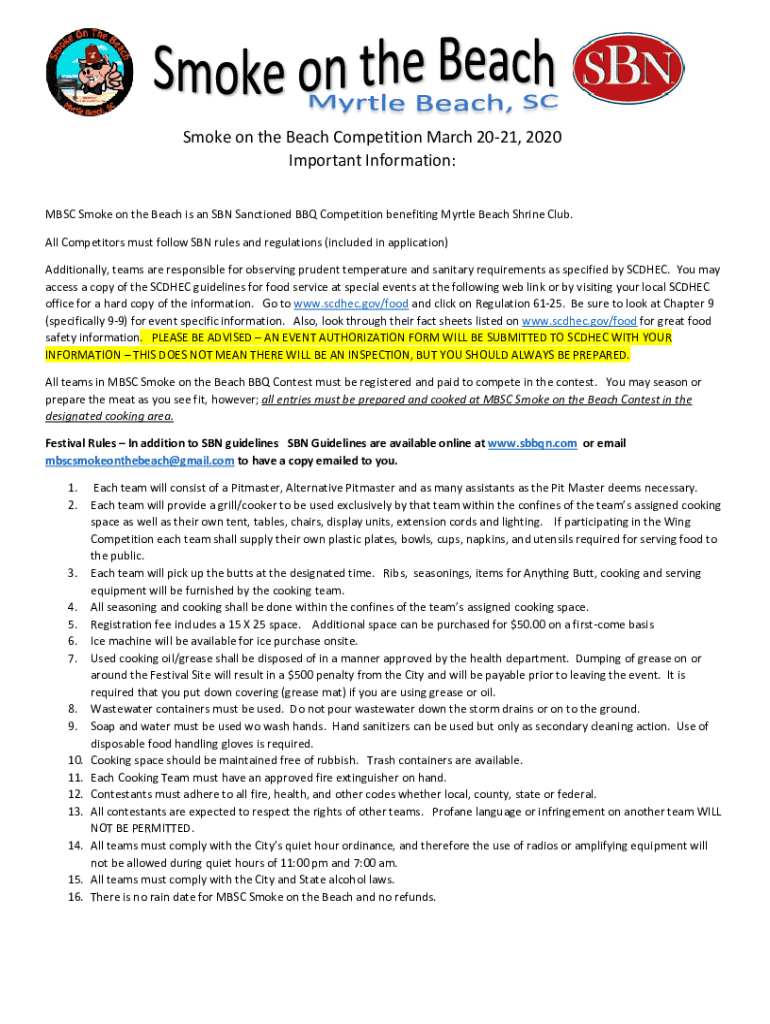 Smoke on the Beach Competition March 2021, 2020 Important Information: MBSC Smoke on the Beach is an SBN Sanctioned BBQ Competition benefiting Myrtle Beach Shrine Club. All Competitors must follow