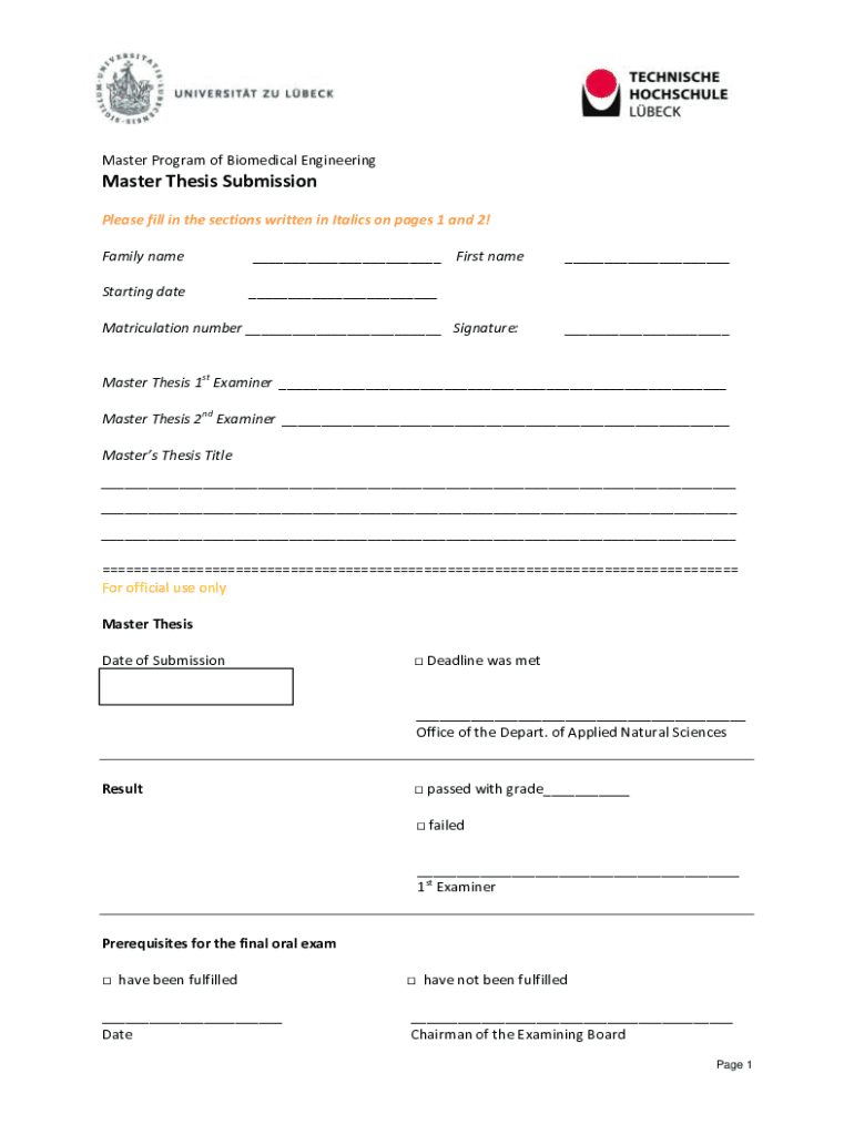 Master Program of Biomedical EngineeringMaster Thesis Submission Please fill in the sections written in Italics on pages 1 and 2! Family name___ First nameStarting date___Matriculation number ___
