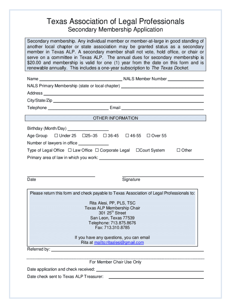 Texas Association of Legal Professionals Secondary Membership Application Secondary membership. Any individual member or memberatlarge in good standing of another local chapter or state association