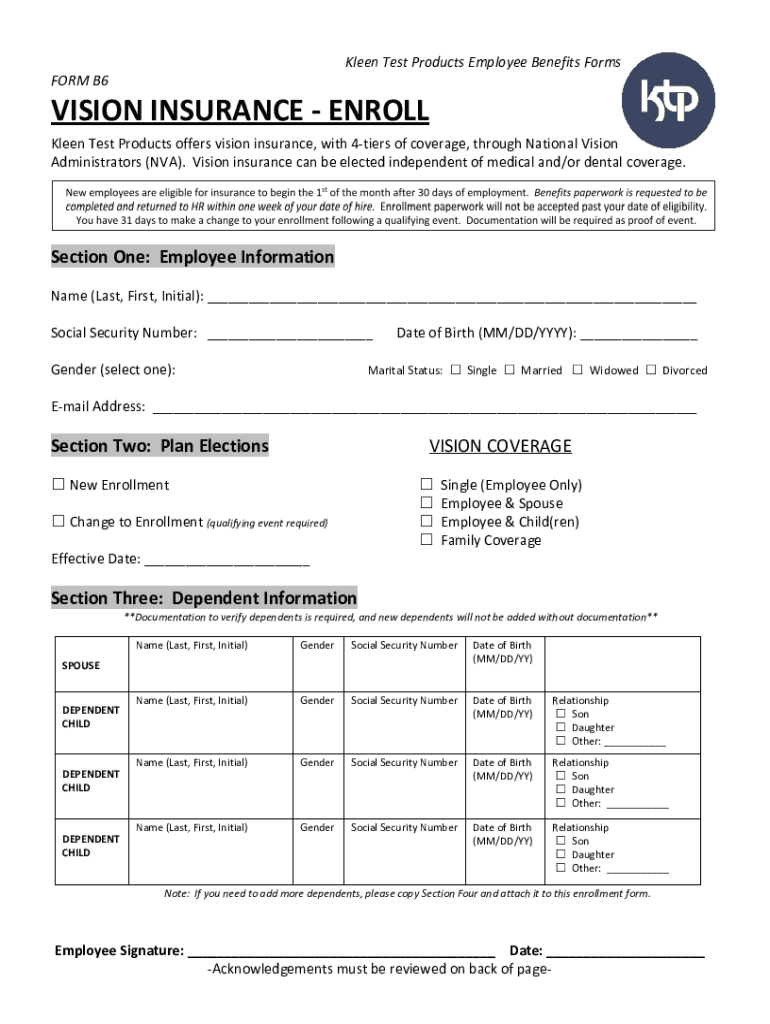 To fill out ktp-benefits-forms-form-b6-vision-enrollment, employees need to provide their personal information, select the desired vision plan, and sign the form.