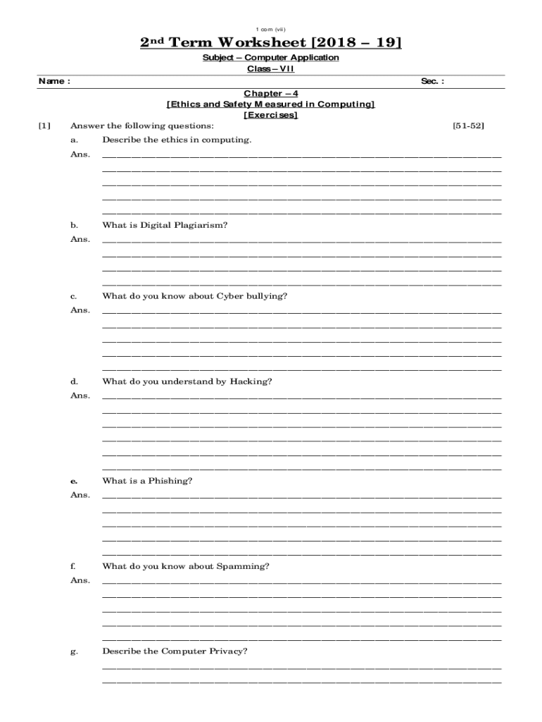 1 com (vii)2nd Term Worksheet [2018 19] Subject Computer Application Class VII Name :[1]Sec. : Chapter 4 [Ethics and Safety Measured in Computing] [Exercises] Answer the following questions:[5152]a.Describe