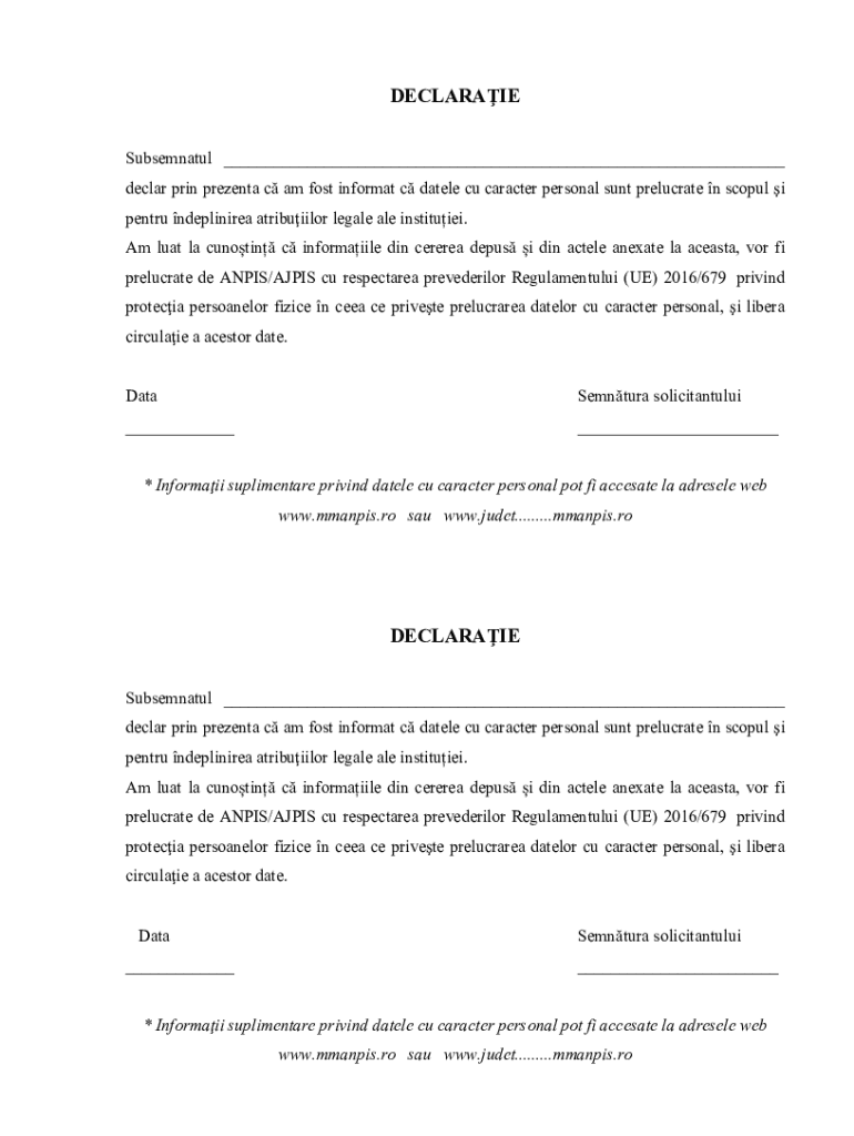 DECLARAIE Subsemnatul ___ declar prin prezenta c am fost informat c datele cu caracter personal sunt prelucrate n scopul i pentru ndeplinirea atribuiilor legale ale instituiei. Am luat la cunotin