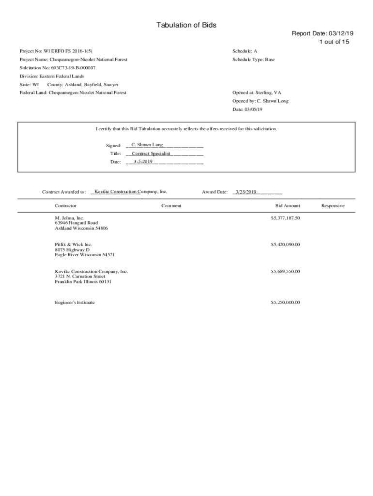Tabulation of Bids Report Date: 03/12/19 1 out of 15 Project No: WI ERFO FS 20161(5)Schedule: AProject Name: ChequamegonNicolet National ForestSchedule Type: BaseSolcitation No: 693C7319B000007 Division: