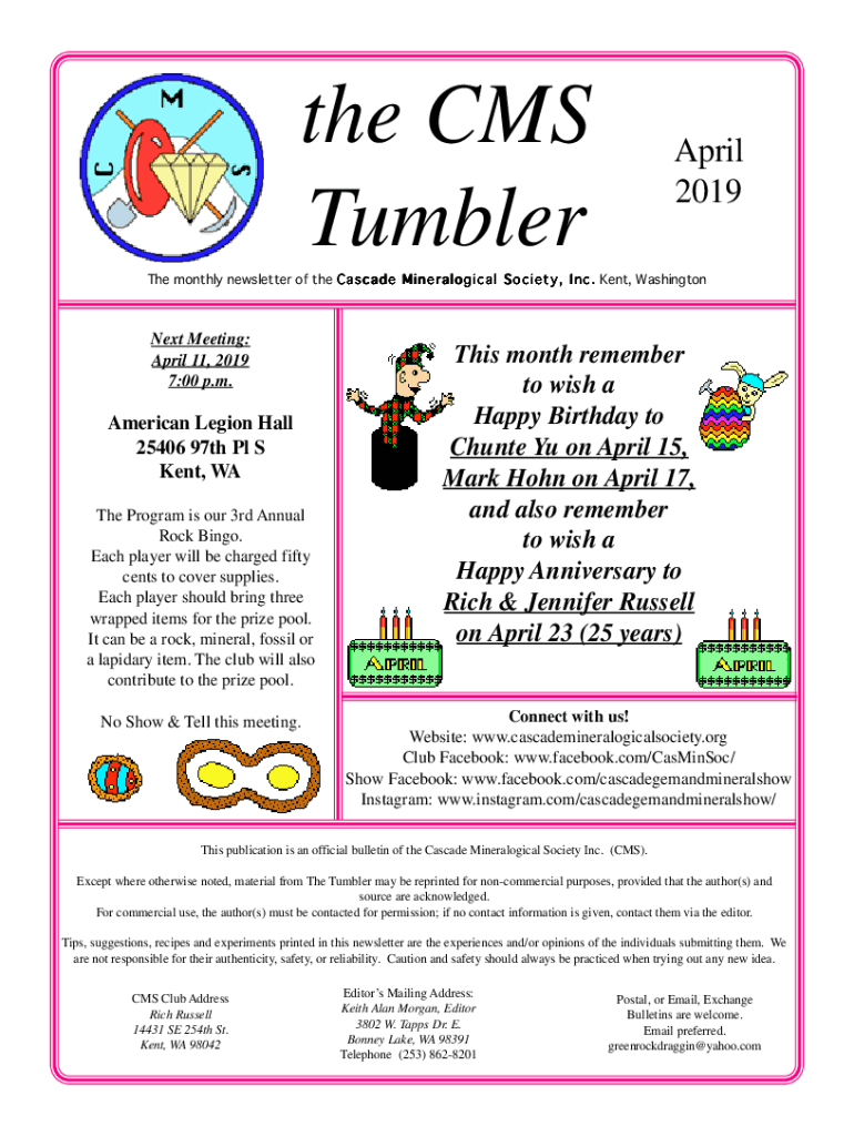 2019The monthly newsletter of the C an s c a d e M i n e r an l o g i c an l S o c i e t y, I n c. Kent, WashingtonNext Meeting: