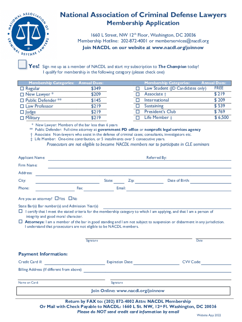 To fill out NACDL membership, visit the official NACDL website, complete the online application form, provide necessary documentation, and submit the membership fee.