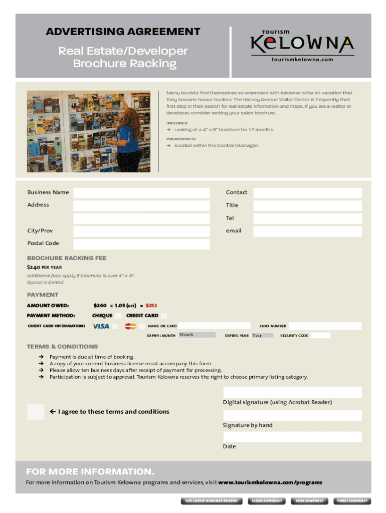 ADVERTISING AGREEMENTReal Estate/Developer Brochure RackingMany tourists find themselves so enamored with Kelowna while on vacation that they become househunters. The Harvey Avenue Visitor Centre