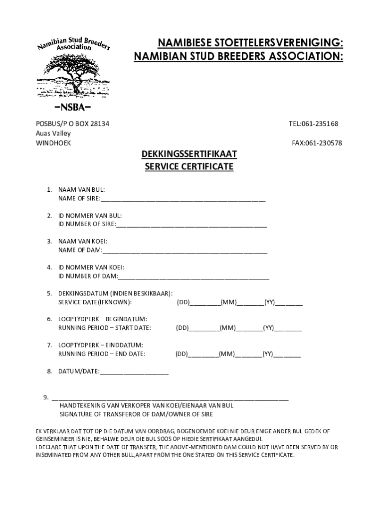 NAMIBIESE STOETTELERSVERENIGING: NAMIBIAN STUD BREEDERS ASSOCIATION:POSBUS/P O BOX 28134 Auas Valley WINDHOEKTEL:061235168 FAX:061230578DEKKINGSSERTIFIKAAT SERVICE CERTIFICATE 1. NAAM VAN BUL: NAME