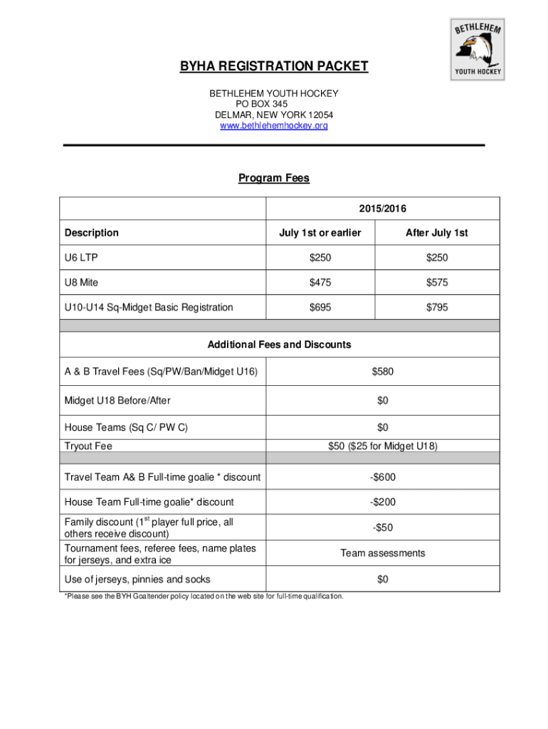 BYHA REGISTRATION PACKET BETHLEHEM YOUTH HOCKEY PO BOX 345 DELMAR, NEW YORK 12054 www.bethlehemhockey.orgProgram Fees 2015/2016 DescriptionJuly 1st or earlierAfter July 1stU6 LTP$250$250U8 Mite$475$575U10U14
