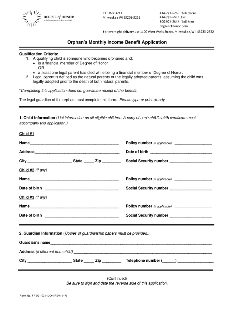 P.O.Box3211 MilwaukeeWI5320132114142736266Telephone 4142786535Fax 8009272547TollFree degreeofhonor.comForovernightdeliveryuse1100WestWellsStreet,Milwaukee,WI532332332Orphans Monthly Income Benefit