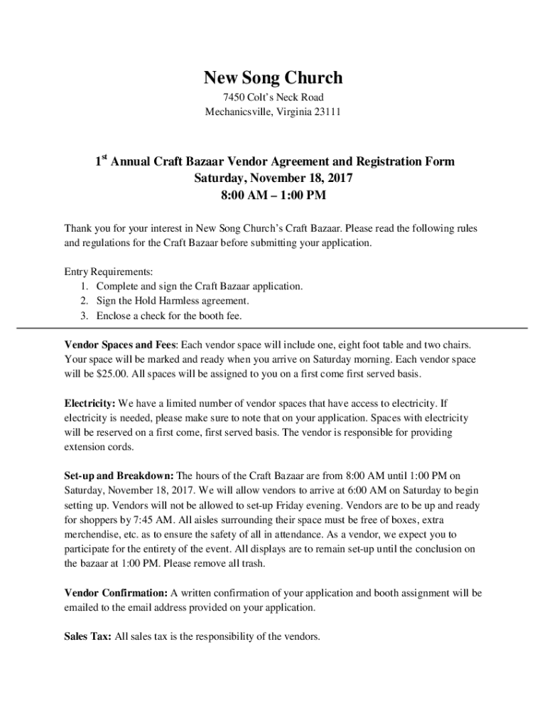 New Song Church 7450 Colts Neck Road Mechanicsville, Virginia 231111st Annual Craft Bazaar Vendor Agreement and Registration Form Saturday, November 18, 2017 8:00 AM 1:00 PM Thank you for your interest