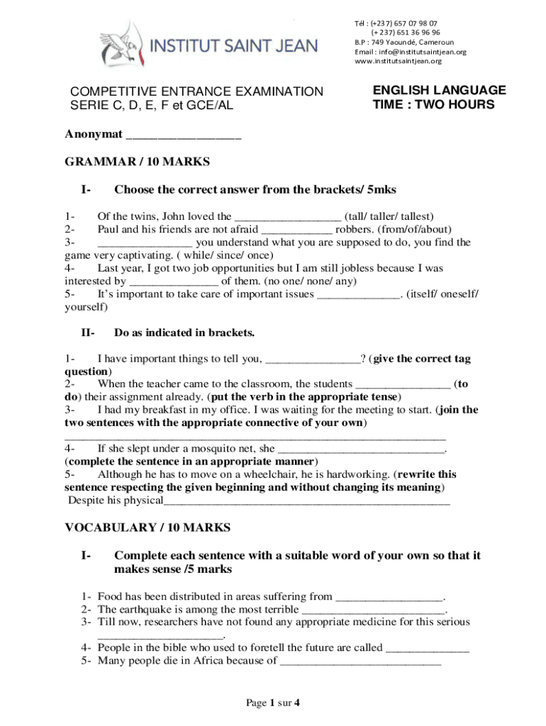 Tl : (+237) 657 07 98 07 (+ 237) 651 36 96 96 B.P : 749 Yaound, Cameroun Email : info@institutsaintjean.org www.institutsaintjean.orgCOMPETITIVE ENTRANCE EXAMINATION SERIE C, D, E, F et GCE/ALENGLISH