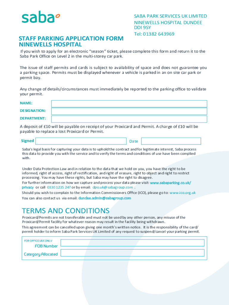 STAFF PARKING APPLICATION FORM NINEWELLS HOSPITALSABA PARK SERVICES UK LIMITED NINEWELLS HOSPITAL DUNDEE DDI 9SY Tel: 01382 643969If you wish to apply for an electronic season ticket, please complete