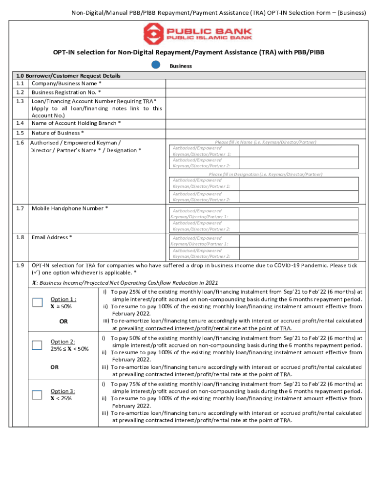 NonDigital/Manual PBB/PIBB Repayment/Payment Assistance (TRA) OPTIN Selection Form (Business)OPTIN selection for NonDigital Repayment/Payment Assistance (TRA) with PBB/PIBB Business 1.0 Borrower/Customer
