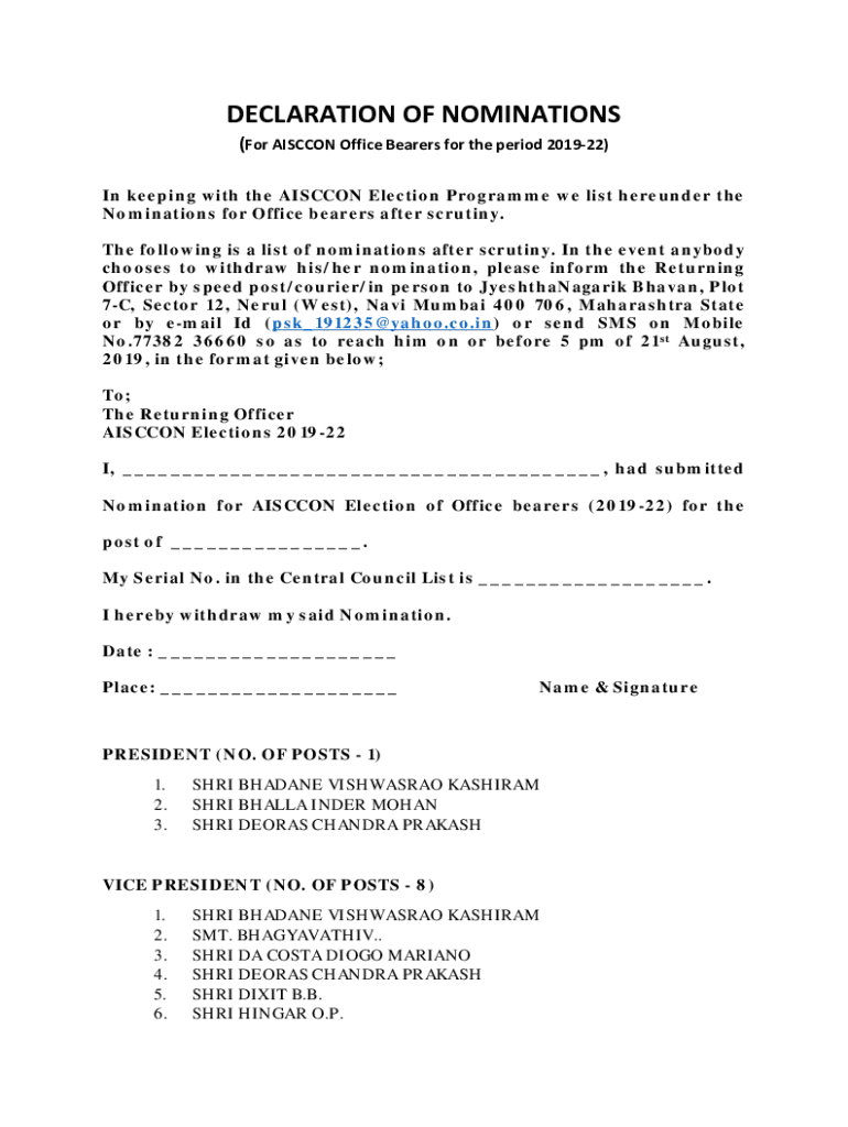 DECLARATION OF NOMINATIONS (For AISCCON Office Bearers for the period 201922) In keeping with the AISCCON Election Programme we list hereunder the Nominations for Office bearers after scrutiny. The