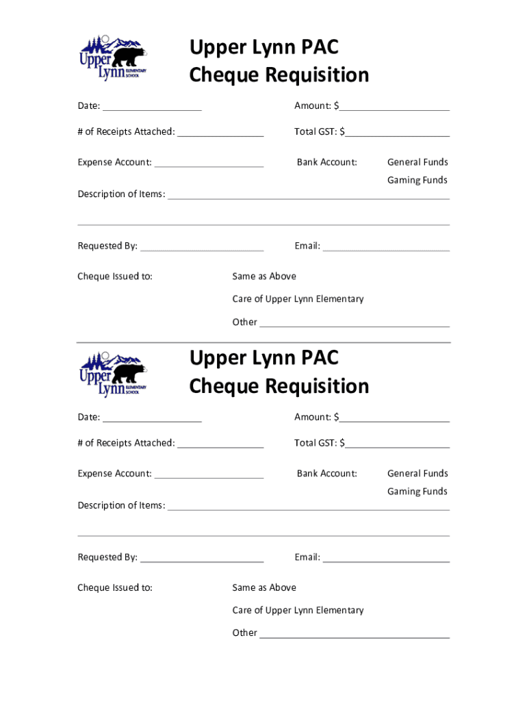 Upper Lynn PACCheque RequisitionDate:# of Receipts Attached:Amount: $Total GST: $Expense Account:Bank Account:General FundsDescription of Items:Requested By:Gaming FundsEmail:Cheque Issued to:Same