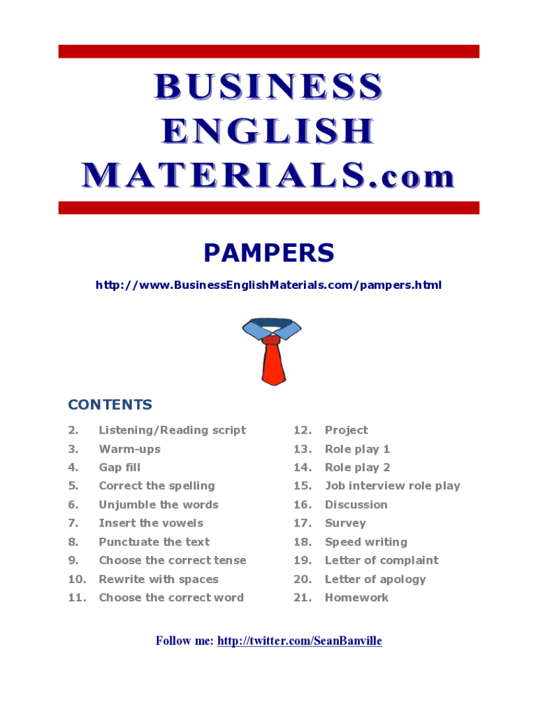 BUSINESS ENGLISH M A T E R I A L S .com PAMPERS http://www.BusinessEnglishMaterials.com/pampers.htmlCONTENTS 2.Listening/Reading script12.Project3.Warmups13.Role play 14.Gap fill14.Role play 25.Correct
