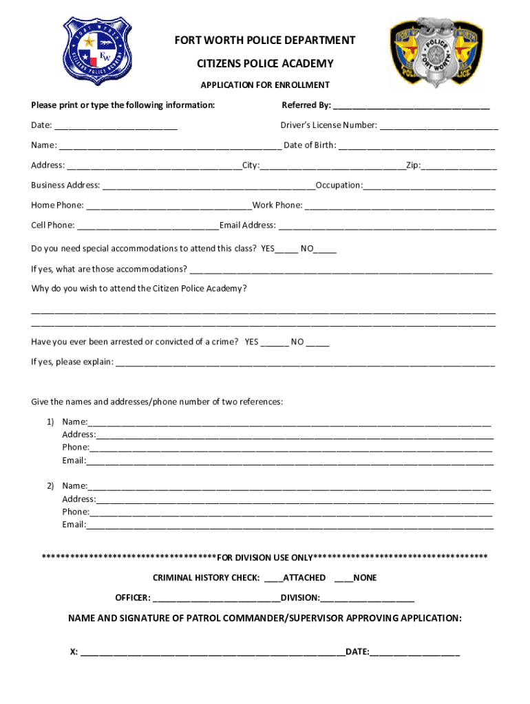 FORT WORTH POLICE DEPARTMENT CITIZENS POLICE ACADEMY APPLICATION FOR ENROLLMENT Please print or type the following information:Referred By: ___Date: ___Drivers License Number: ___Name: ___ Date of
