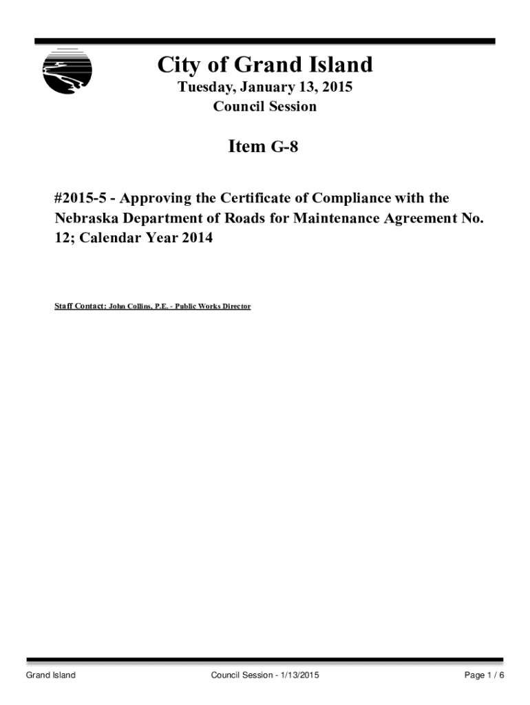 City of Grand Island Tuesday, January 13, 2015 Council SessionItem G8 #20155 Approving the Certificate of Compliance with the Nebraska Department of Roads for Maintenance Agreement No. 12; Calendar
