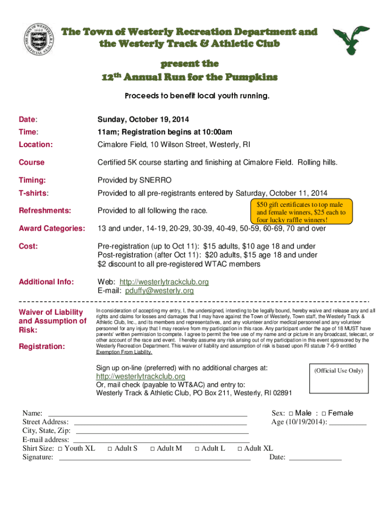 The Town of Westerly Recreation Department and the Westerly Track & Athletic Club present the 12th Annual Run for the Pumpkins Proceeds to benefit local youth running. Date:Sunday, October 19, 2014Time:11am;