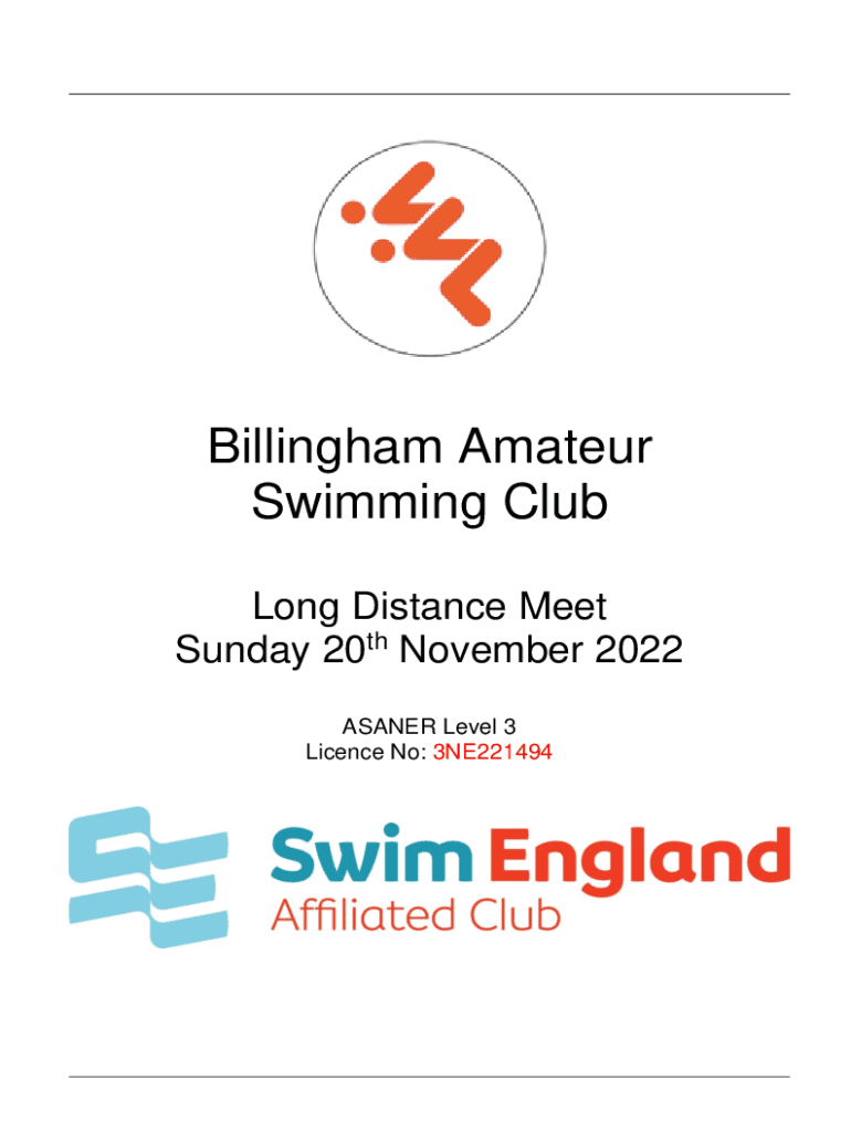 Billingham Amateur Swimming Club Long Distance Meet Sunday 20th November 2022 ASANER Level 3 Licence No: 3NE221494Billingham Amateur Swimming Club Long Distance Meet (Affiliated to N&D & ASA NER)License