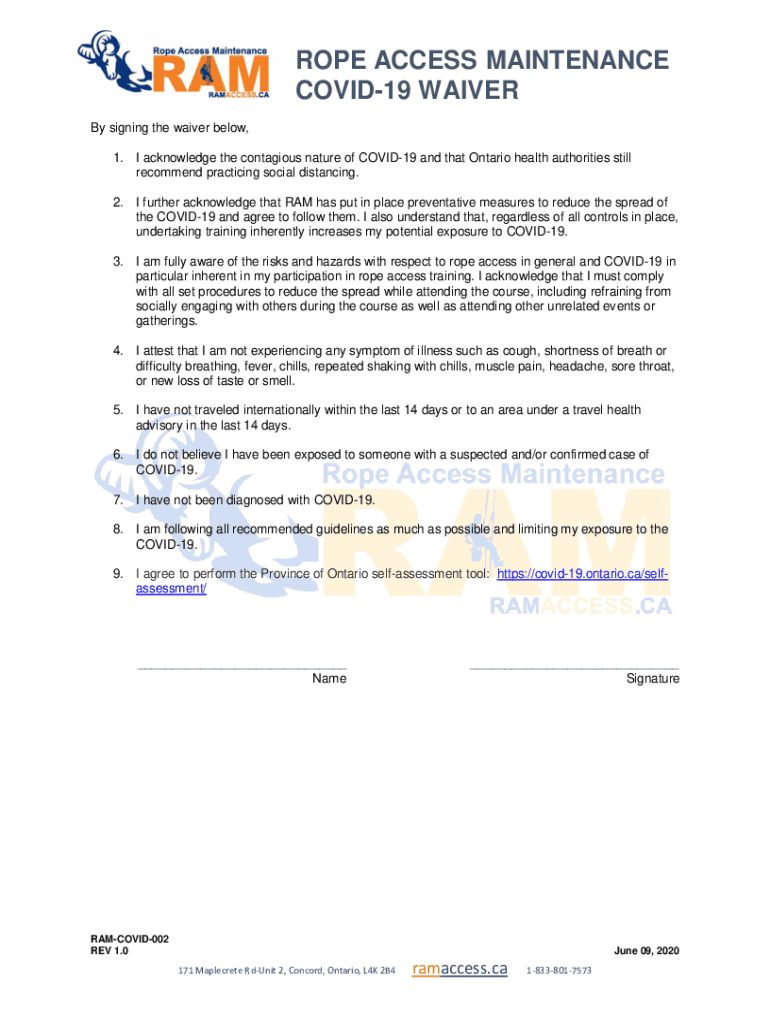 ROPE ACCESS MAINTENANCE COVID-19 WAIVER By signing the waiver below, 1. I acknowledge the contagious nature of COVID-19 and that Ontario health authorities still recommend practicing social distancing.