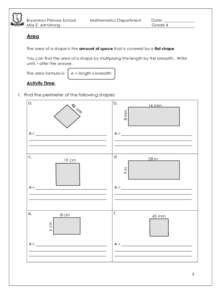 Bryanston Primary School Miss E. ArmstrongMathematics DepartmentDate: ___ Grade 4Area The area of a shape is the amount of space that is covered by a flat shape. You can find the area of a shape by