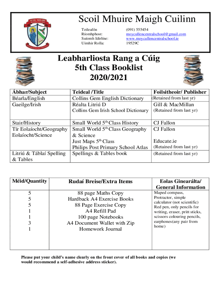 Scoil Mhuire Maigh Cuilinn Teileafn Romhphost: Suomh Idirlne: Uimhir Rolla:(091) 555454 moycullencentralschool@gmail.com www.moycullencentralschool.ie 19529CLeabharliosta Rang a Cig 5th Class Booklist