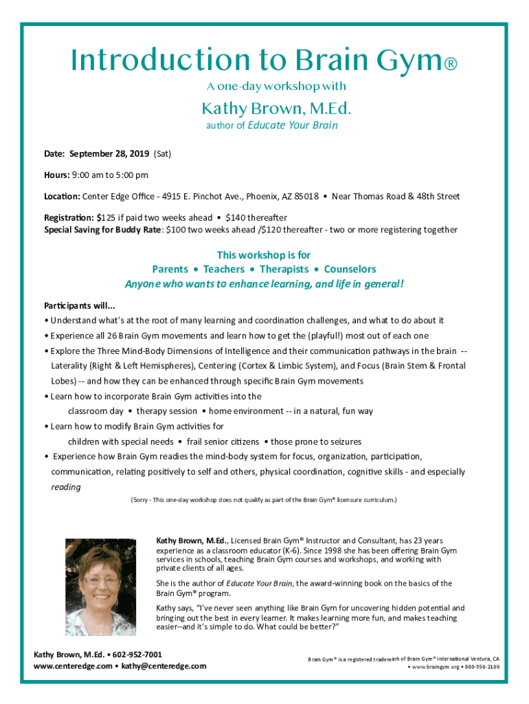 Introduction to Brain Gym A oneday workshop withKathy Brown, M.Ed. author of Educate Your BrainDate:September 28, 2019(Sat) Hours: 9:00 am to 5:00 pmLoca8on: Center Edge Oce 4915 E. Pinchot Ave.,