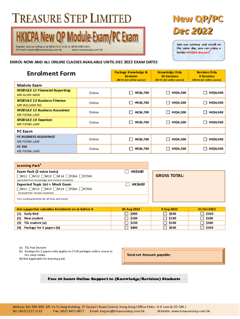 New QP/PC Dec 2022 Join our seminar and enroll on the same day, you can enjoy a # further HK$200 discountRegister now by calling us at (852) 2117 1112 or (852) 6085 1815 Or Email: enquiry@treasurestep.com.hk