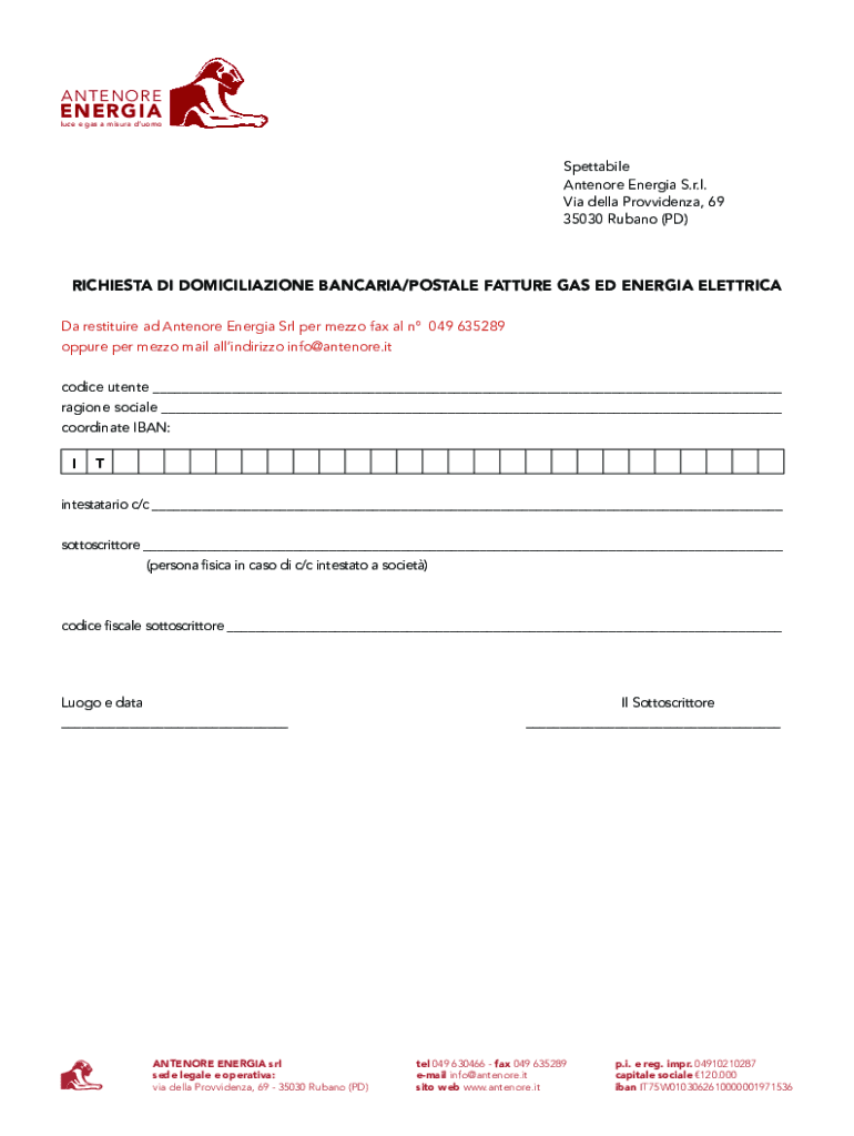 ANTENOREENERGIAluce e gas a misura d\'uomo_Spettabile Antenore Energia S.r.l. Via della Provvidenza, 69 35030 Rubano (PD)RICHIESTA DI DOMICILIAZIONE BANCARIA/POSTALE FATTURE GAS ED ENERGIA ELETTRICA