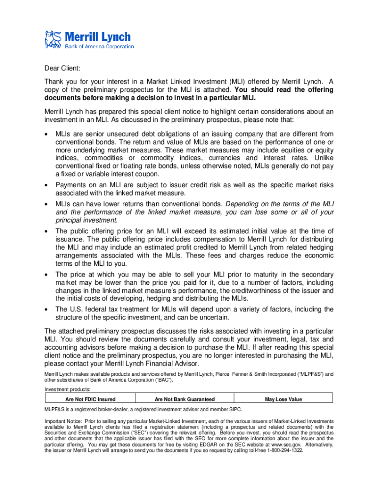 Dear Client: Thank you for your interest in a Market Linked Investment (MLI) offered by Merrill Lynch. A copy of the preliminary prospectus for the MLI is attached. You should read the offering documents