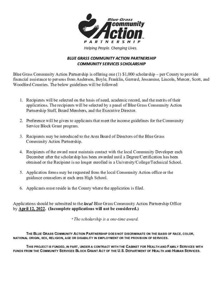 BLUE GRASS COMMUNITY ACTION PARTNERSHIP COMMUNITY SERVICES SCHOLARSHIP Blue Grass Community Action Partnership is offering one (1) $1,000 scholarship per County to provide financial assistance to