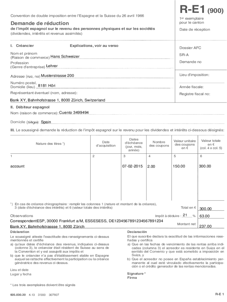 RE1Convention de double imposition entre l\'Espagne et la Suisse du 26 avril 1966cgoo1er exemplaire pour le cantonDemande de rduction de l\'impt espagnol sur le revenu des personnes physiques et sur
