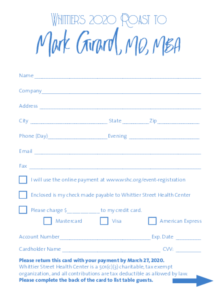 Whittiers 2020 Roast toMark Girard, MD, MBA Name___ Company___ Address___ City___ State___Zip___ Phone (Day)___ Evening_ ___ Email_ ___ Fax_ ___nI will use the online payment at www.wshc.org/eventregistrationnEnclosed