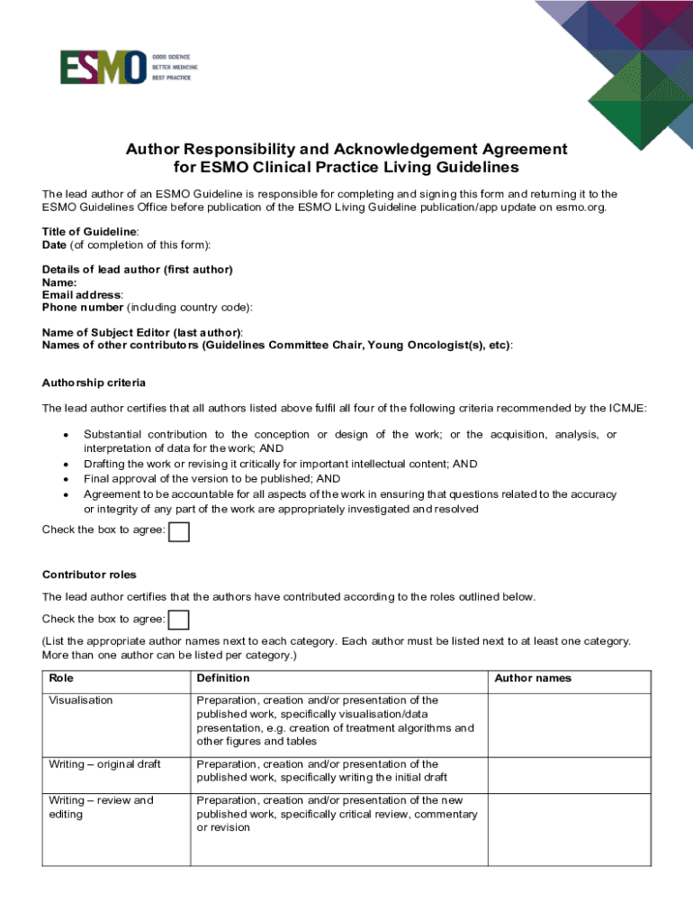 Get the free ESMO Clinical Practice Living Guidelines Author Agreement Form. ESMO