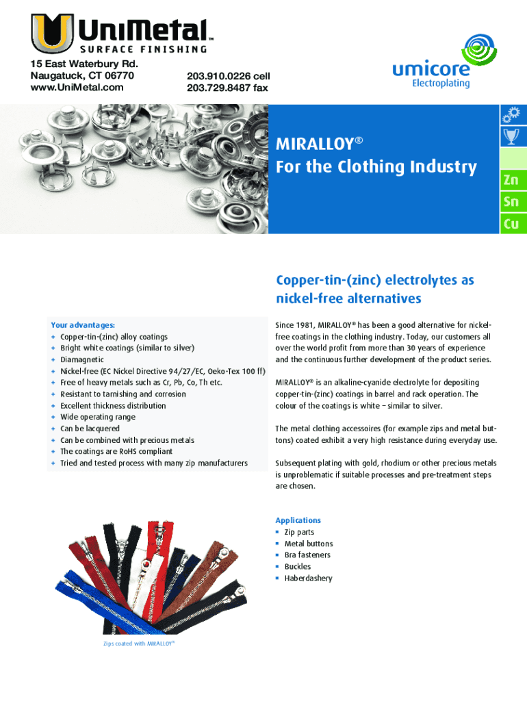 15 East Waterbury Rd. Naugatuck, CT 06770 www.UniMetal.com203.910.0226 cell 203.729.8487 faxMIRALLOY MIRALLOY For the Clothing Clothing Industry IndustryCoppertin(zinc) Coppertin(zinc) electrolytes