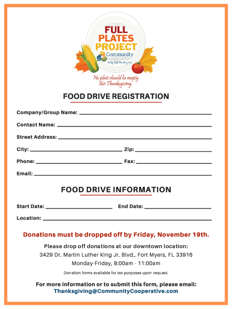 FOOD DRIVE REGISTRATION Company/Group Name: Contact Name: Street Address: City:Zip:Phone:Fax:Email:FOOD DRIVE INFORMATION Start Date:End Date:Location:Donations must be dropped off by Friday, November