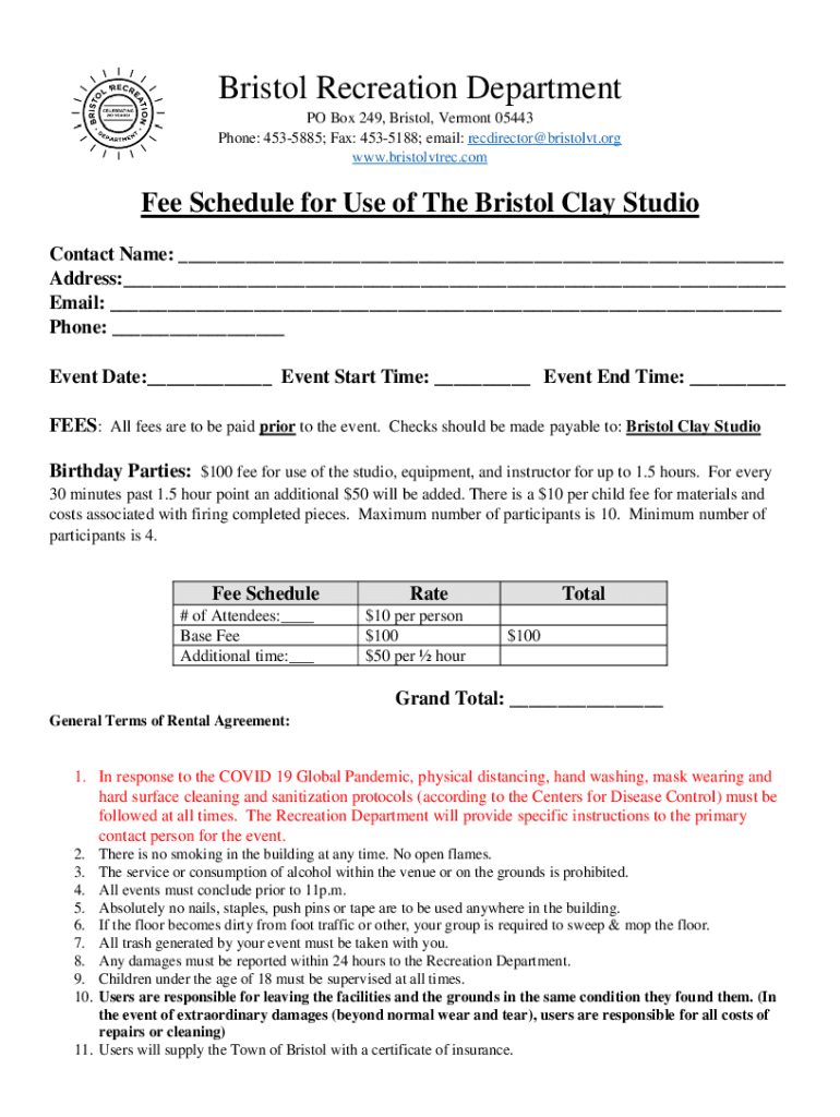 Bristol Recreation Department PO Box 249, Bristol, Vermont 05443 Phone: 4535885; Fax: 4535188; email: recdirector@bristolvt.org www.bristolvtrec.comFee Schedule for Use of The Bristol Clay Studio