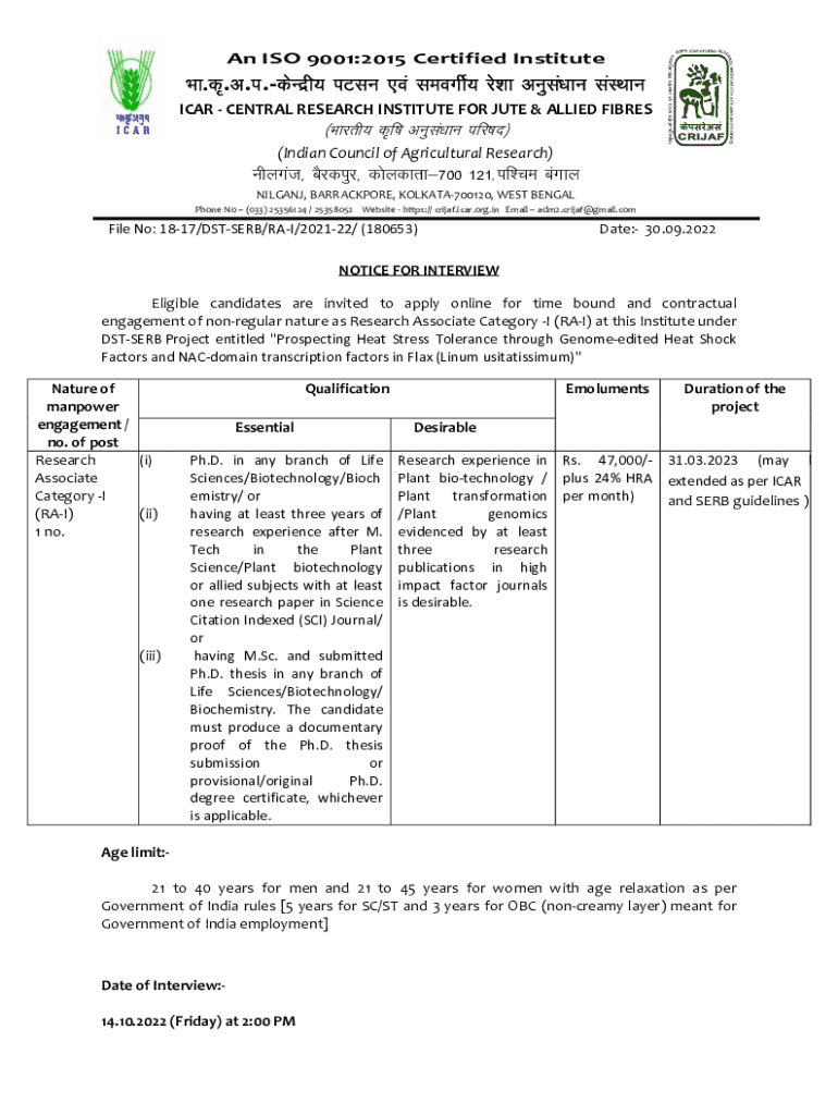 An ISO 9001:2015 Certified InstituteHkk.d`.v.i.dsUnzh; iVlu ,oa leoxhZ; jskk vuqla/kku laLFkku ICAR CENTRAL RESEARCH INSTITUTE FOR JUTE & ALLIED FIBRESHkkjrh; d`fk vuqla/kku ifjkn (Indian Council