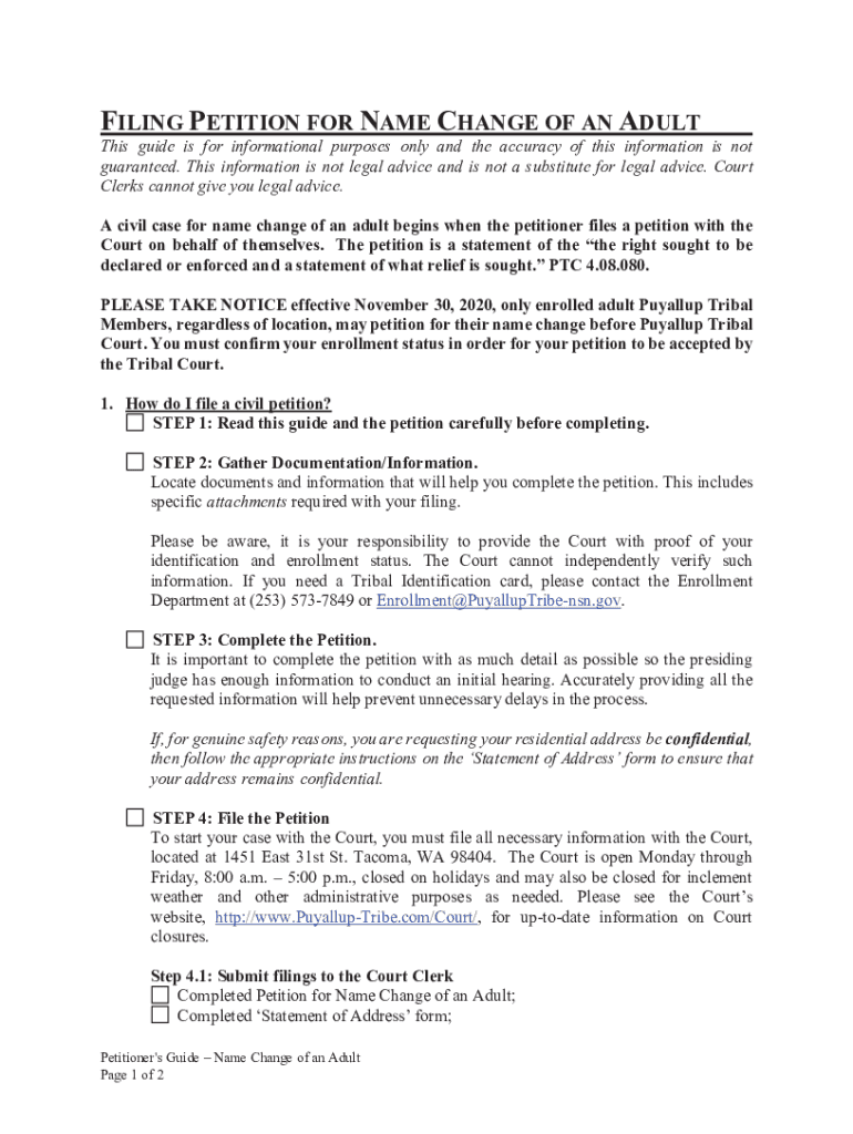 Petitioner\'s Packet 1DPH&KDQJHRIDQ$GXOW Contents: Petitioner\'s Guide $GGUHVV$XWKRUL]DWLRQIRU6HUYLFH PetitionFILING PETITION FOR NAME CHANGE OF AN ADULT This guide is for informational purposes only