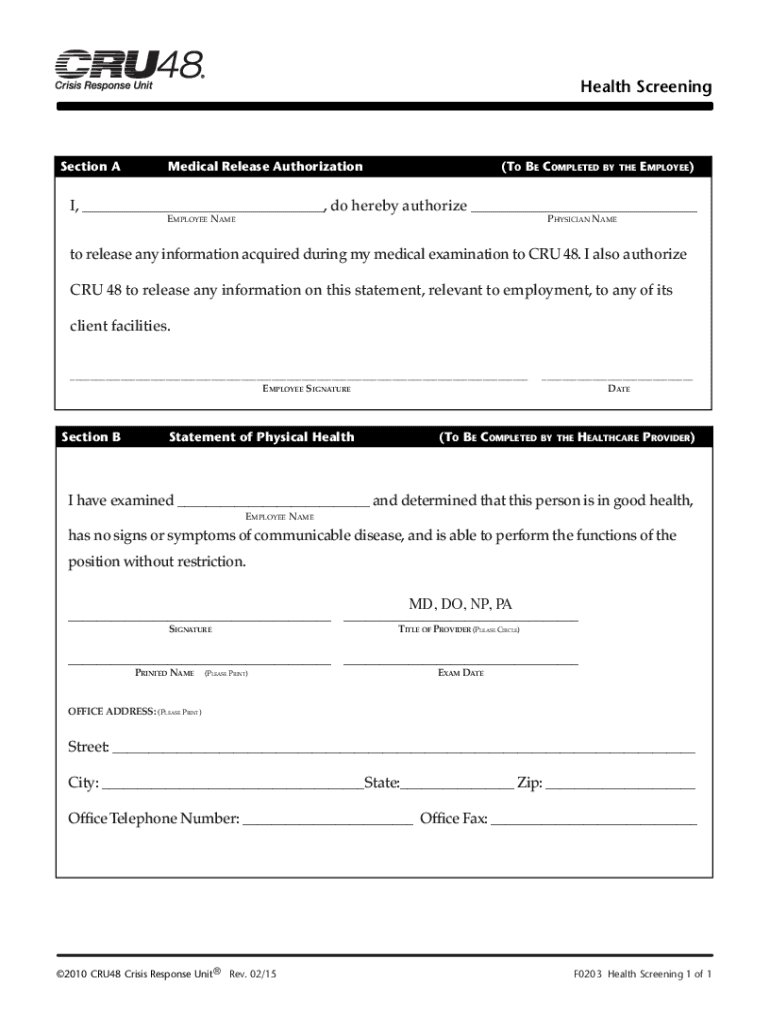 Health ScreeningSection AMedical Release Authorization(To Be Completedby theEmployee)I, ___, do hereby authorize ___Employee Name Physician Nameto release any information acquired during my medical