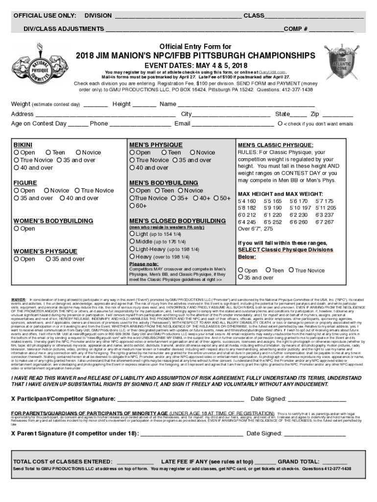OFFICIAL USE ONLY:DIVISION ___ CLASS___ DIV/CLASS ADJUSTMENTS ___COMP # ___Official Entry Form for 2018 JIM MANION\'S NPC/IFBB PITTSBURGH CHAMPIONSHIPS EVENT DATES: MAY 4 & 5, 2018 You may register