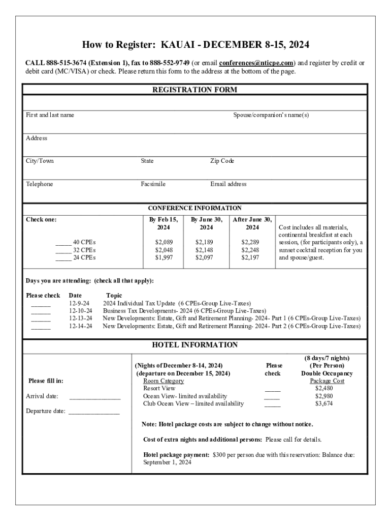 How to Register: KAUAI DECEMBER 815, 2024 CALL 8885153674 (Extension 1), fax to 8885529749 (or email conferences@nticpe.com) and register by credit or debit card (MC/VISA) or check. Please return