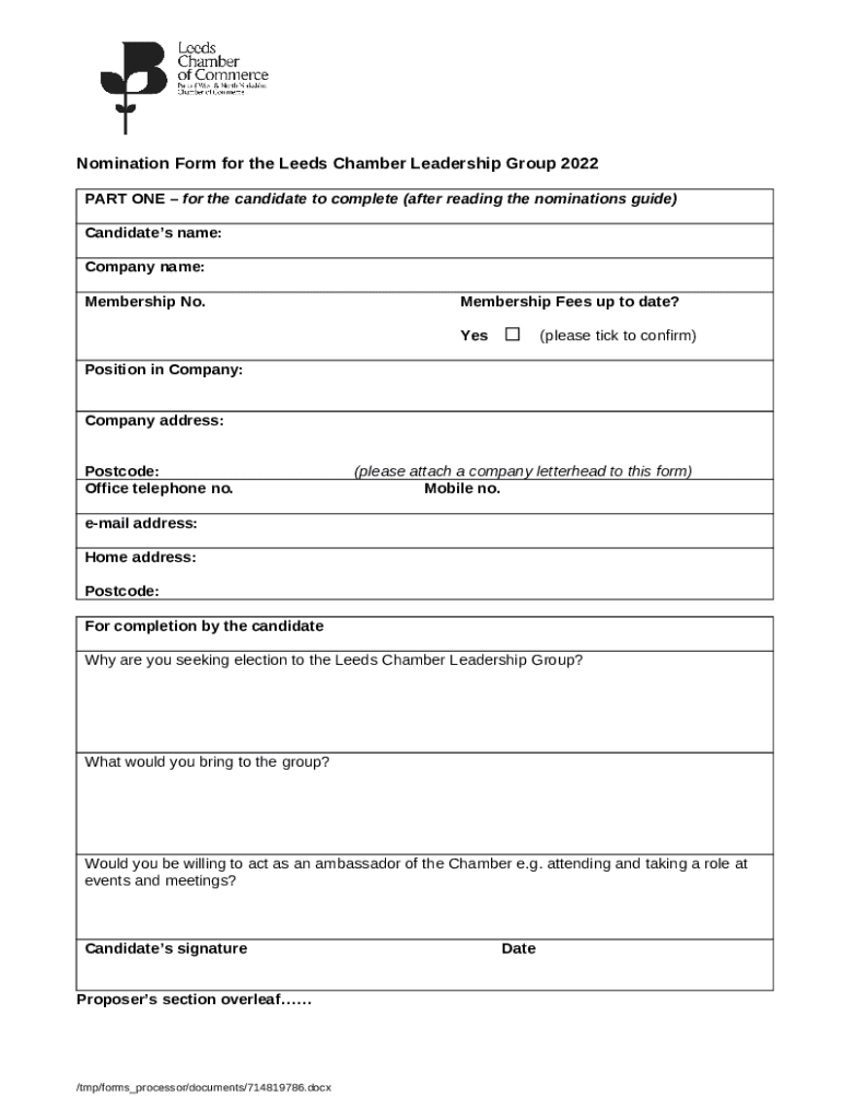 The Nominations for the Bradford Chamber of Commerce Council is a fillable form in MS Word extension that can be filled-out and signed for specified reasons. Next, it is provided to the relevant addressee in order to provide certain information of certain kinds. The completion and signing is possible or using a trusted tool like PDFfiller. Such tools help to fill out any PDF or Word file without printing them out. It also lets you customize its appearance for the needs you have and put a legal digital signature. Once you're good, the user sends the Nominations for the Bradford Chamber of Commerce Council to the respective recipient or several ones by email and even fax. PDFfiller has a feature and options that make your Word form printable. It provides a number of options when printing out appearance. It doesn't matter how you'll deliver a form after filling it out - in hard copy or electronically - it will always look well-designed and clear. To not to create a new document from scratch every time, turn the original form as a template. After that, you will have a rewritable sample.