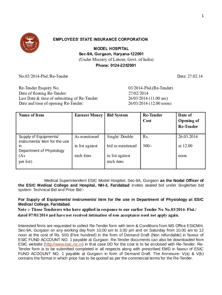 1EMPLOYEES STATE INSURANCE CORPORATION MODEL HOSPITAL Sec9A, Gurgaon, Haryana122001(Under Ministry of Labour, Govt. of India) Phone: 01242252001No.03/2014Fbd./ReTenderDate: 27.02.14ReTender Enquiry
