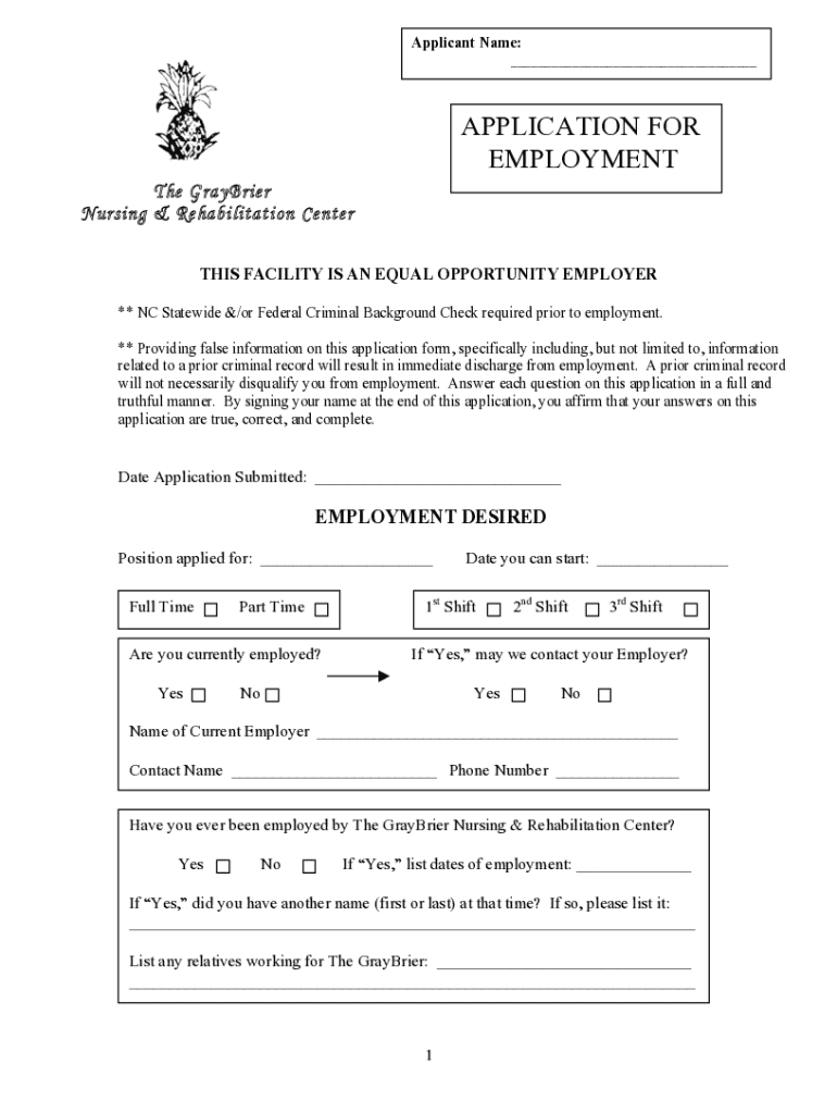 Applicant Name: ___APPLICATION FOR EMPLOYMENT The GrayBrier Nursing & Rehabilitation Center THIS FACILITY IS AN EQUAL OPPORTUNITY EMPLOYER ** NC Statewide &/or Federal Criminal Background Check required
