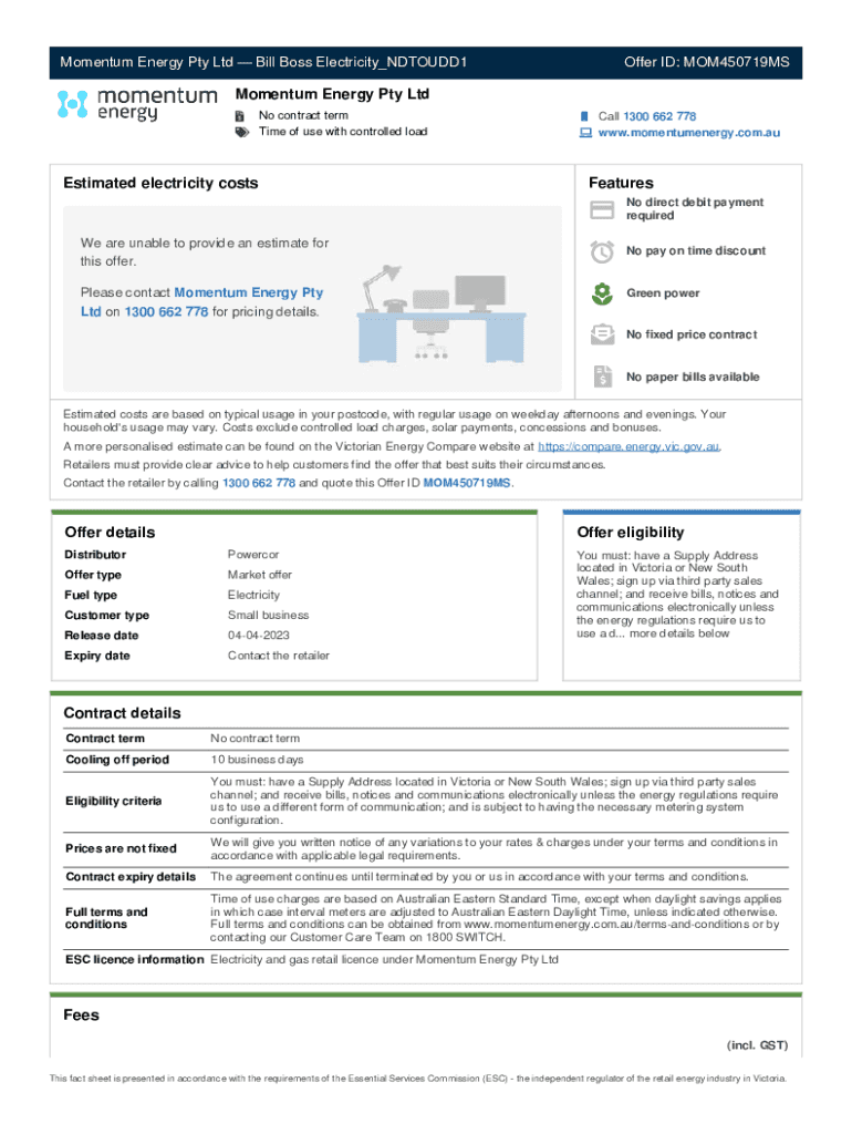 Momentum Energy Pty Ltd Bill Boss Electricity_NDTOUDD1Offer ID: MOM450719MSMomentum Energy Pty Ltd No contract term Time of use with controlled loadEstimated electricity costsCall 1300 662 778 www.momentumenergy.com.auFeatures