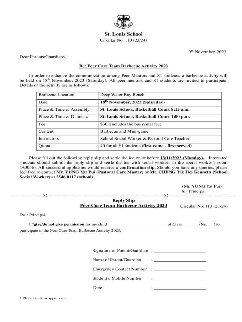 St. Louis School Circular No. 110 (23/24) 9th November, 2023 Dear Parents/Guardians, Re: Peer Care Team Barbecue Activity 2023 In order to enhance the communication among Peer Mentors and S1 students,