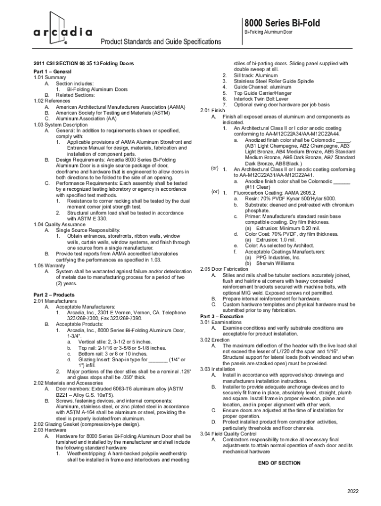 8000 Series BiFold BiFolding Aluminum DoorProduct Standards and Guide Specifications 2011 CSI SECTION 08 35 13 Folding Doors Part 1 General 1.01 Summary A. Section includes: 1. BiFolding Aluminum