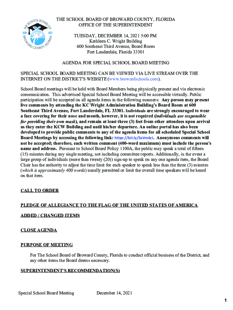 THE SCHOOL BOARD OF BROWARD COUNTY, FLORIDA OFFICE OF THE SUPERINTENDENT TUESDAY, DECEMBER 14, 2021 5:00 PM Kathleen C. Wright Building 600 Southeast Third Avenue, Board Room Fort Lauderdale, Florida